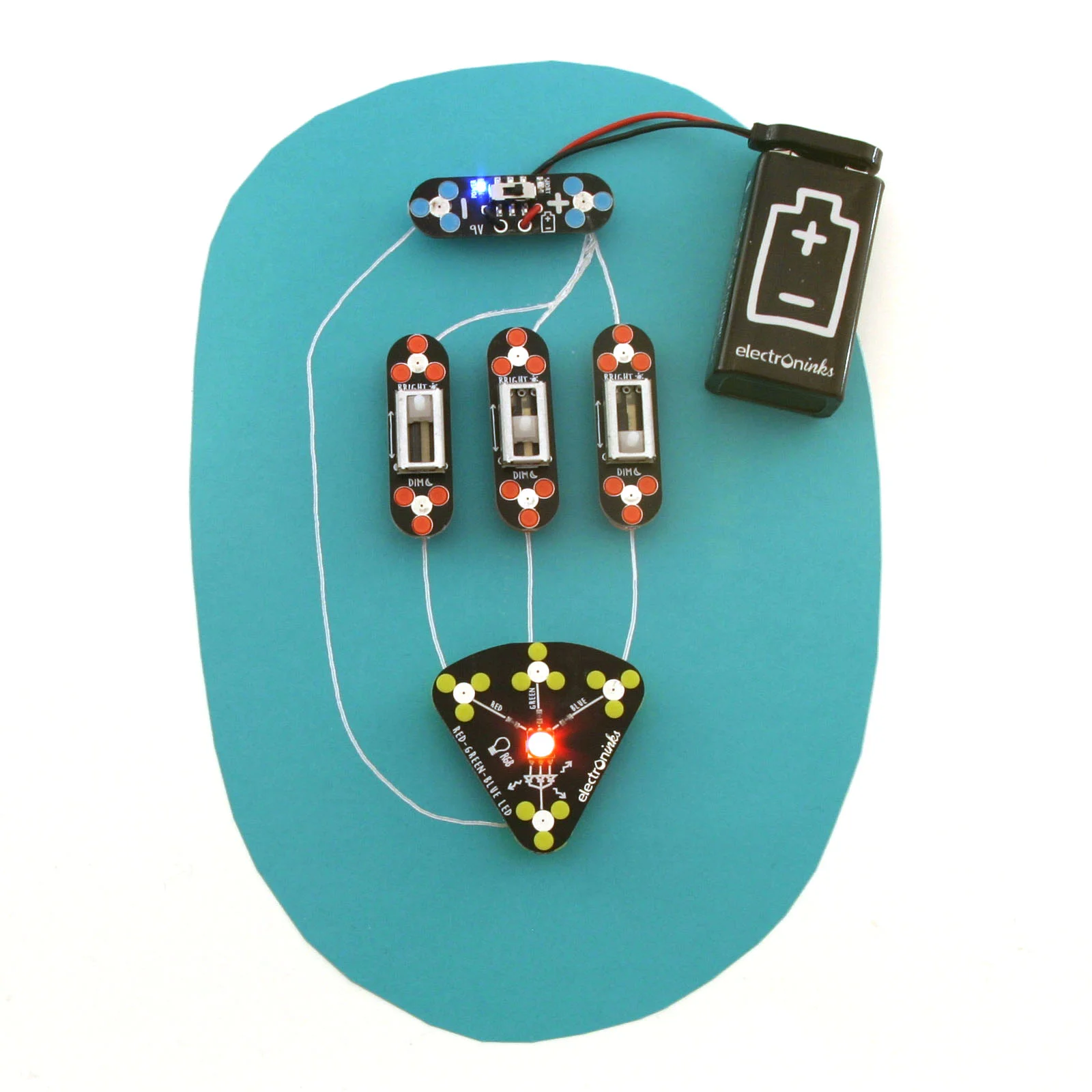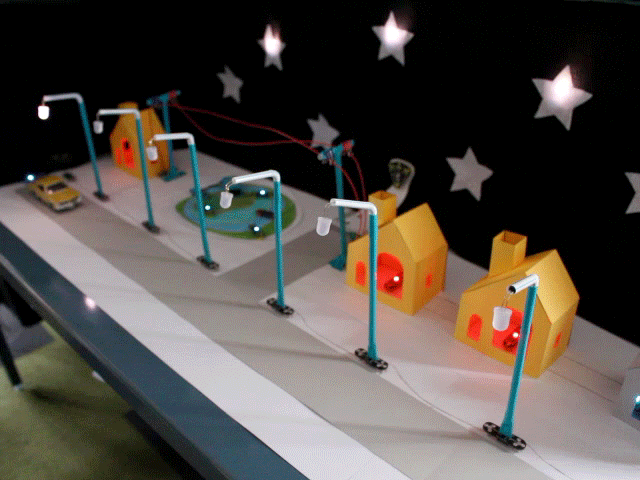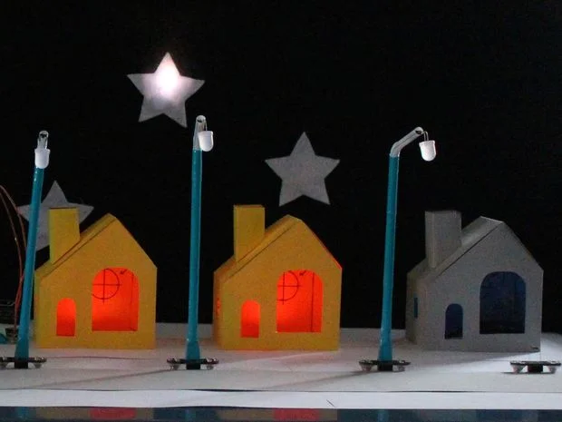 A paper craft cityscape, powered by Circuit Scribe, teaches circuit fundamentals while providing elegant parallels to how a city's electric grid, streetlights, and traffic management actually work.