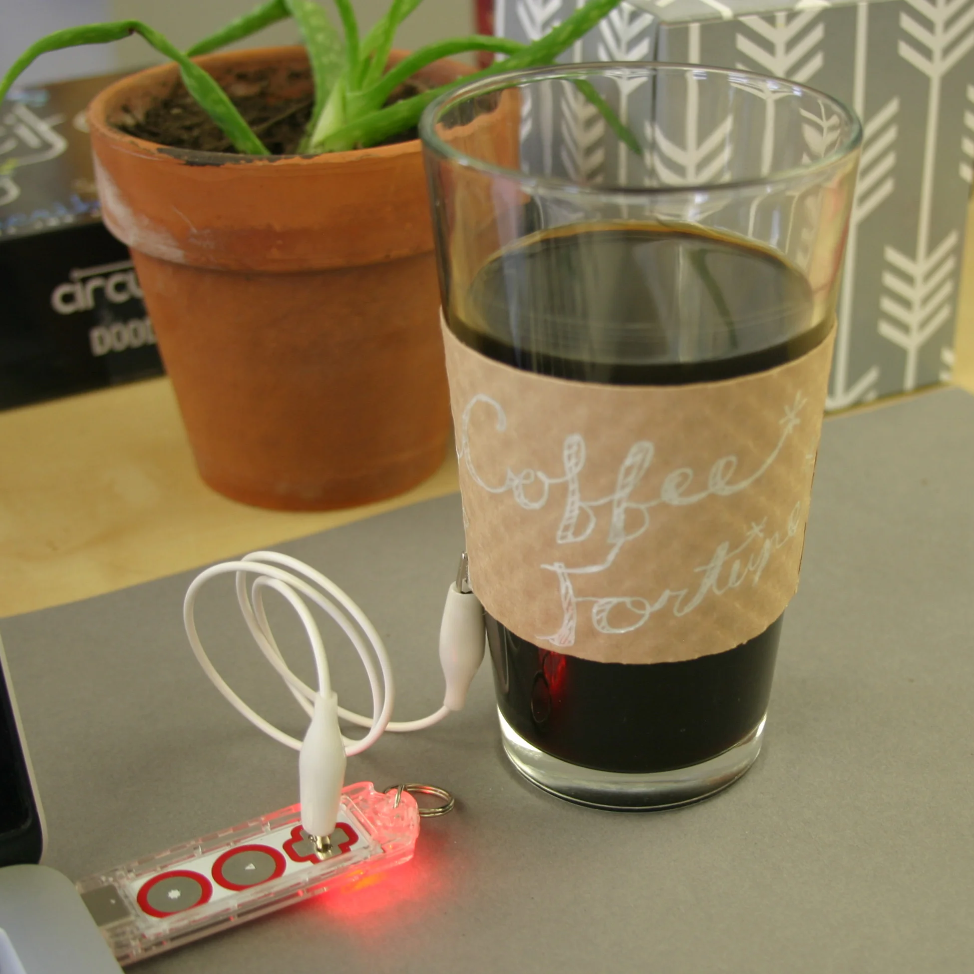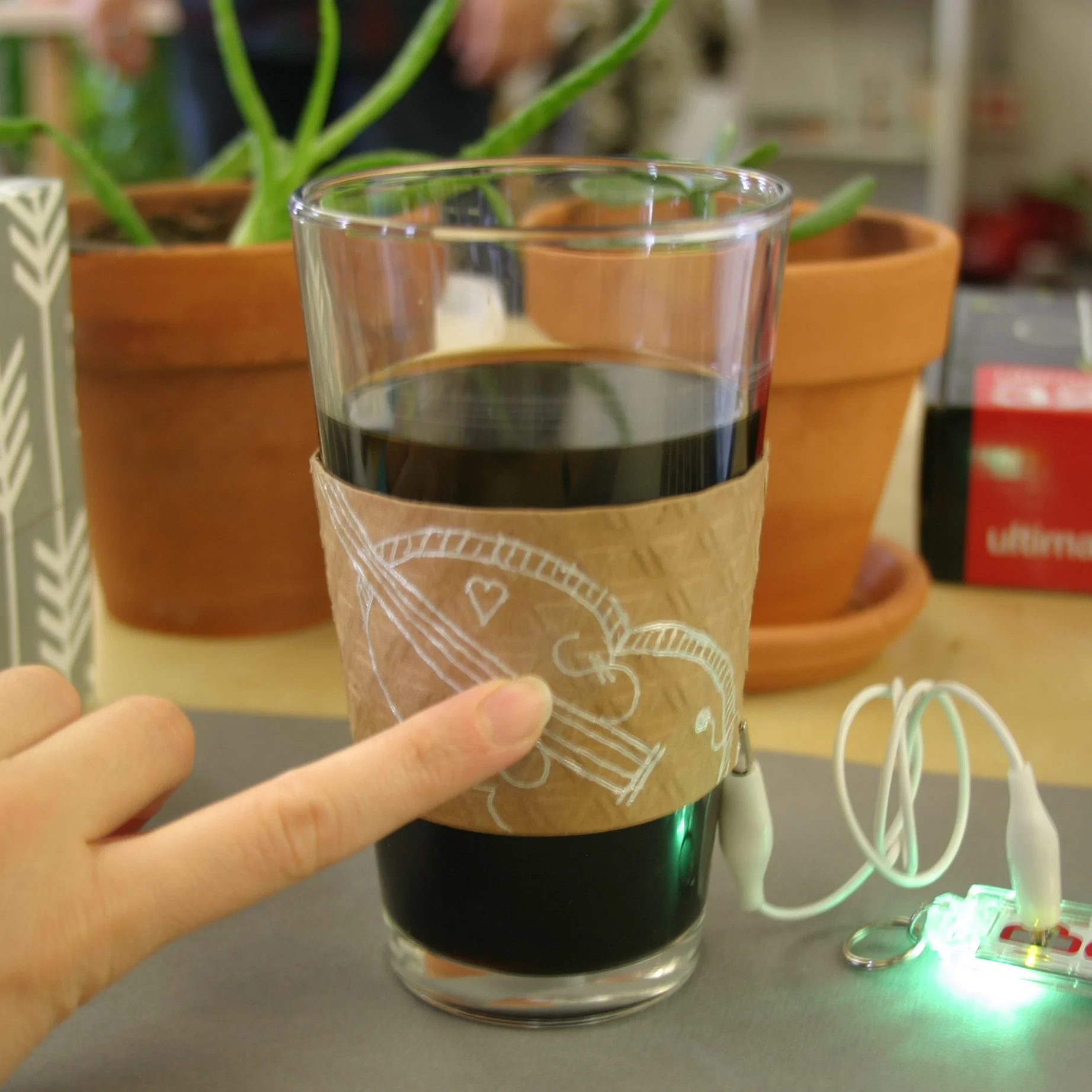 These projects are geared for adult hobbyists to practice visual programming while having their morning coffee. Users draw on a paper coffee sleeve with Circuit Scribe, then alligator clip it to a Makey Makey GO to turn their cup into a single touch sensor. Both projects use the Scratch programming language to create a dynamic interaction: